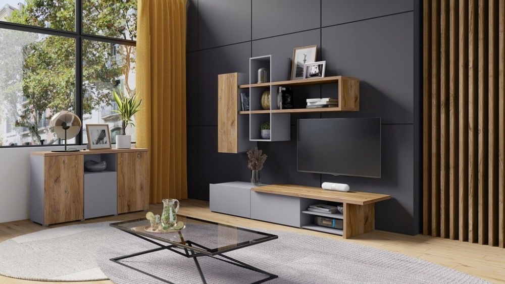 მისაღები ოთახის ტელევიზორის მაგიდა თაროს კომპლექტი KORA (ნაცრისფერი) Helvetia პოლონეთი